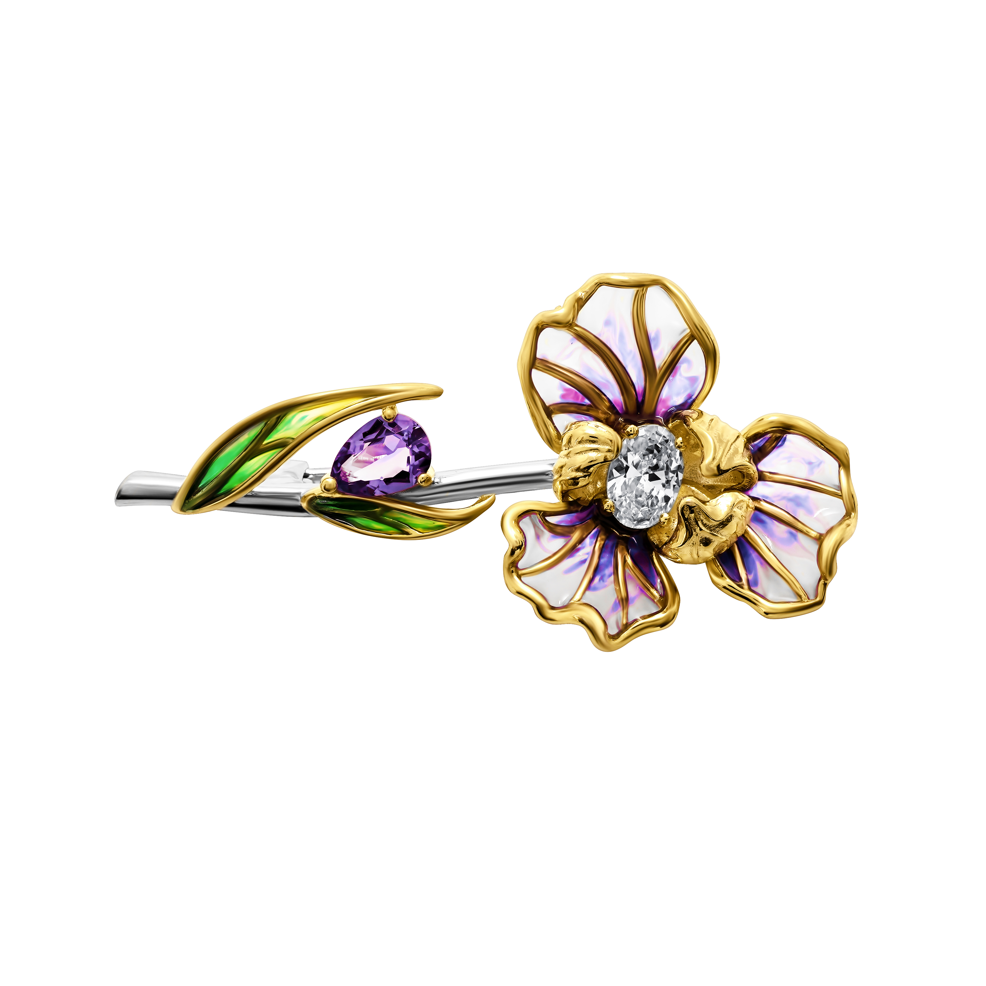 Брошь из серебра с аметистом, эмалью и фианитом