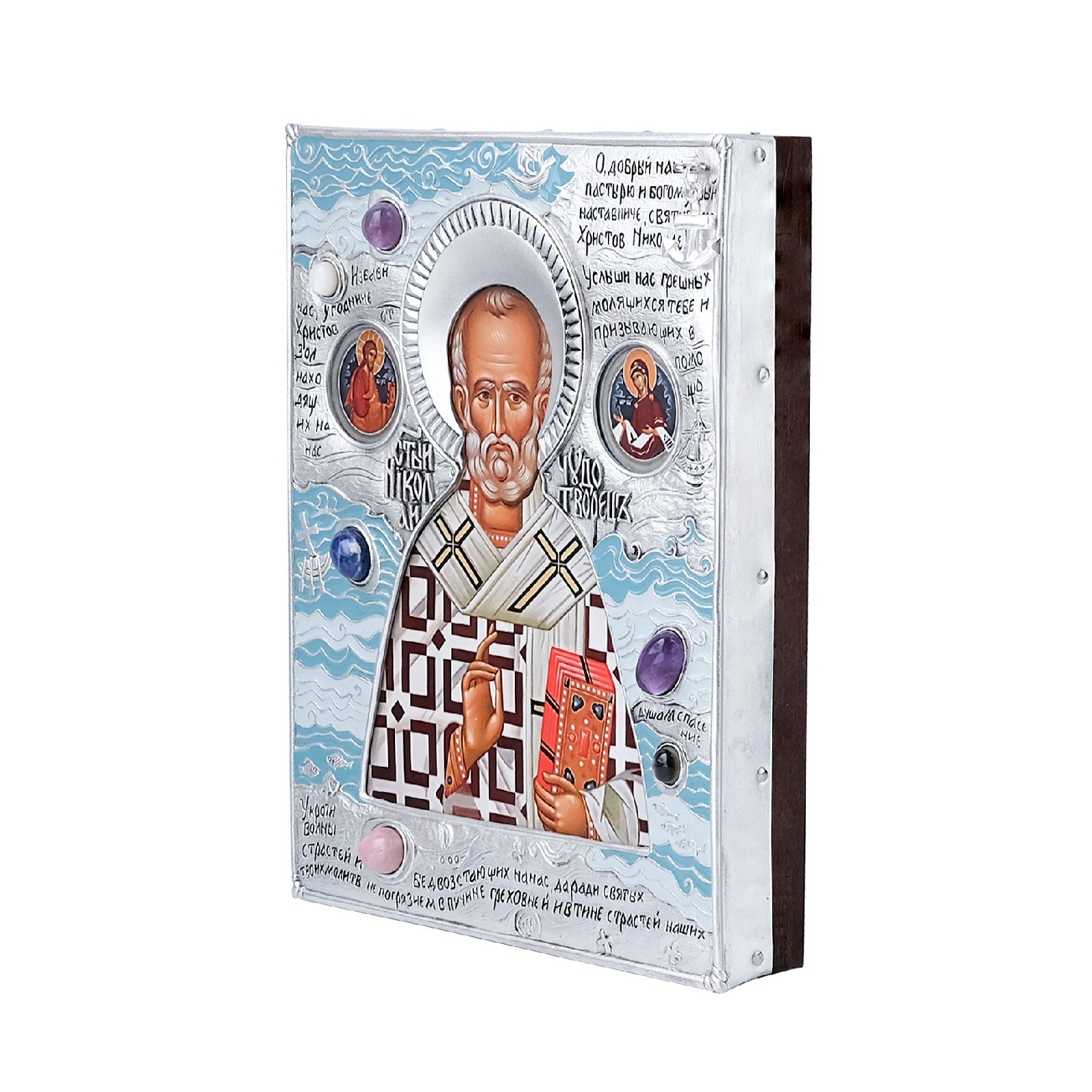 Надписи на лицевой стороне: Святой Николай Чудотворец. О, добрый наш пастырь и богомудрый наствник, Святитель Христов Николае, услыши нас грешных, молящихся тебе и призывающих в помощь. Избави нас, угодниче Христов от зол, находящих на нас. Душам спасение. Укроти волны страстей и бед, возстающих на нас, да ради святых твоих молитв не погрязнем в пучине греховней и в тине страстей наших.