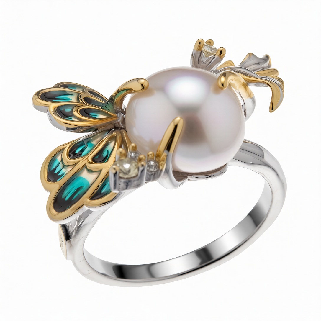 Кольцо из серебра с позолотой, жемчугом, эмалью и фианитами