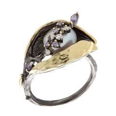 Кольцо из серебра с позолотой, жемчугом и фианитами