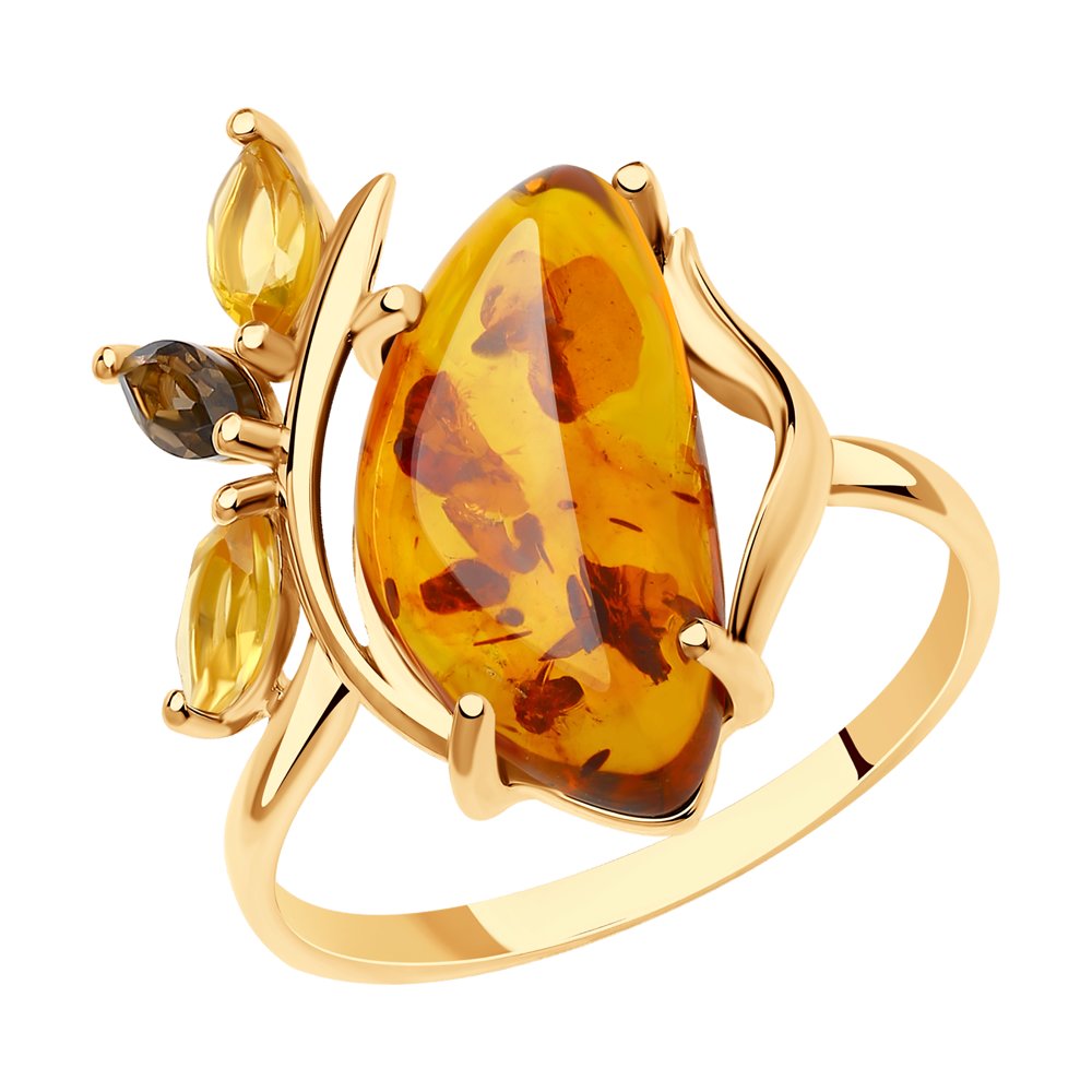 Кольцо из золота с янтарём, раухтопазом и цитринами