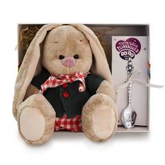 Набор для детей с ложкой из серебра и мягкой игрушкой "Зайка"