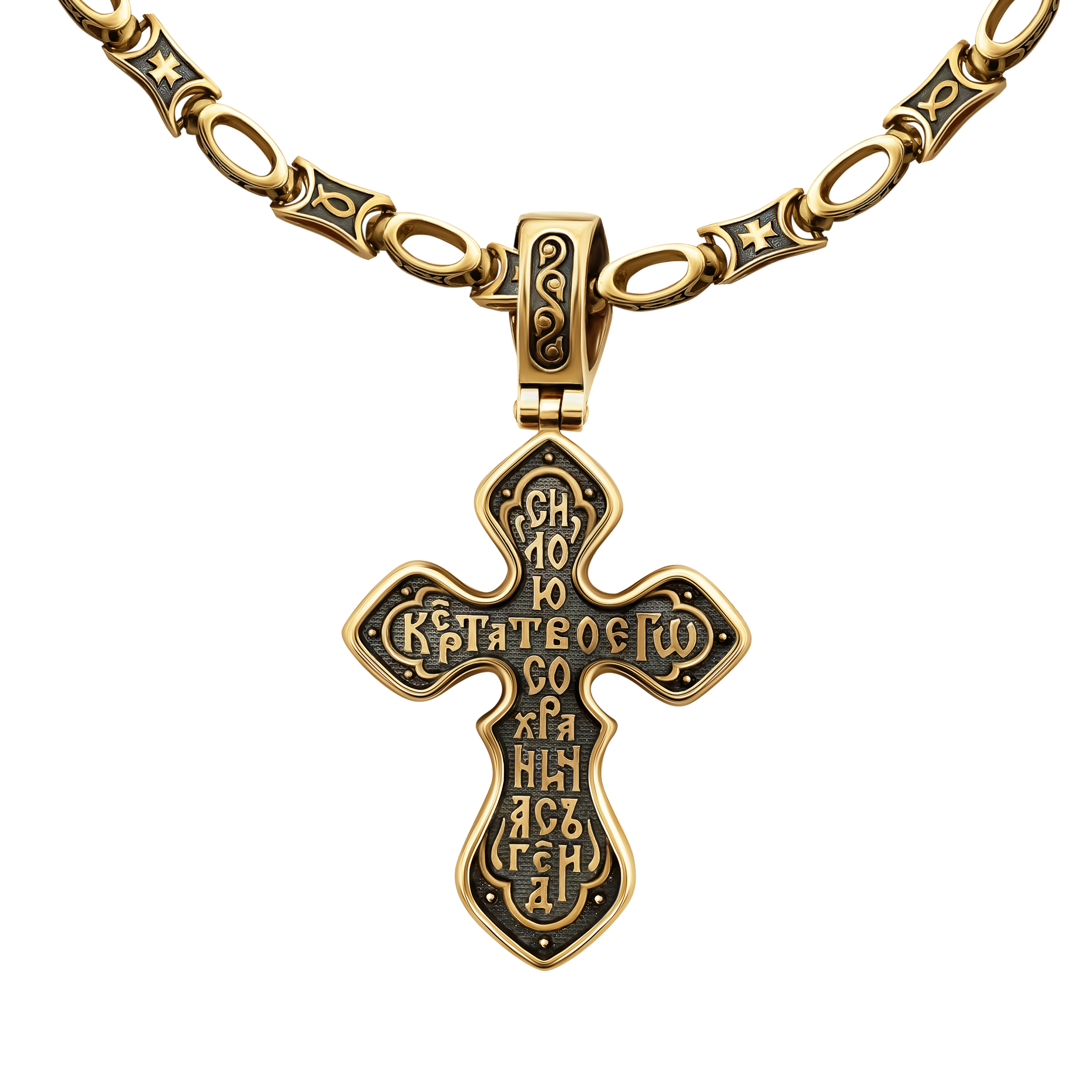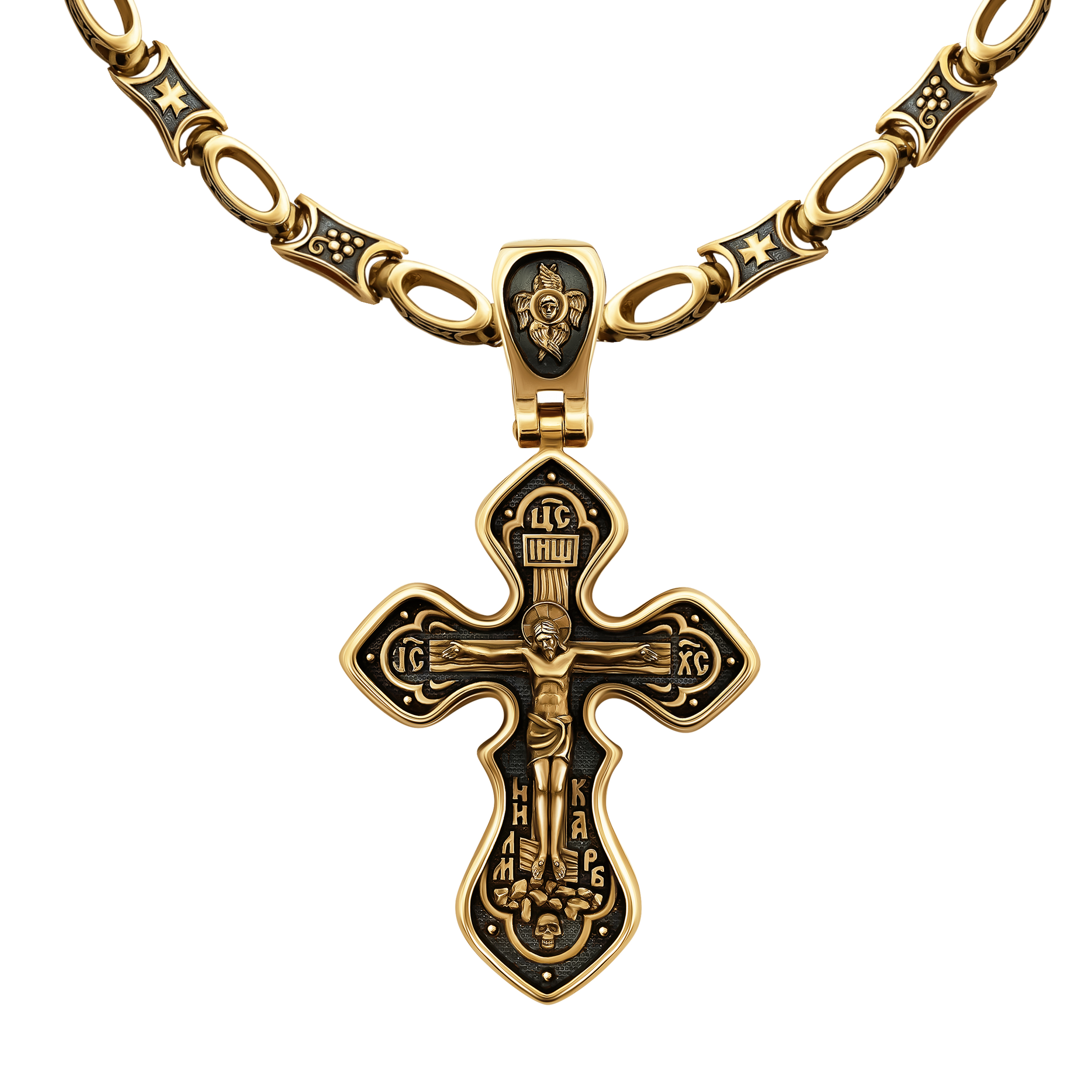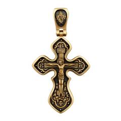 На лицевой стороне этого креста центральную часть занимает икона Распятия Христа — образ жертвы, принесенной Господом за грехи людей. Над титлом видим слова «ЦРЬ СЛВЫ» — Царь Славы. Верхняя перекладина символизирует собой табличку с надписью «IHЦI» - Иисус Назарянин Царь Иудейский. Возле перекладины пишется сокращенно имя Спасителя «IC XC» - Иисус Христос. У подножия мы видим четыре буквы «МЛ» «РБ» – Место Лобное Рай Бысть. Возвышение, на котором стоит Крест, символизирует гору Голгофу, на которой произошло Распятие. У подножия Креста изображают прах Адама, обозначенный черепом. На кулонном кольце изображен шестикрылый Серафим - самый приближенный к Господу Ангел.