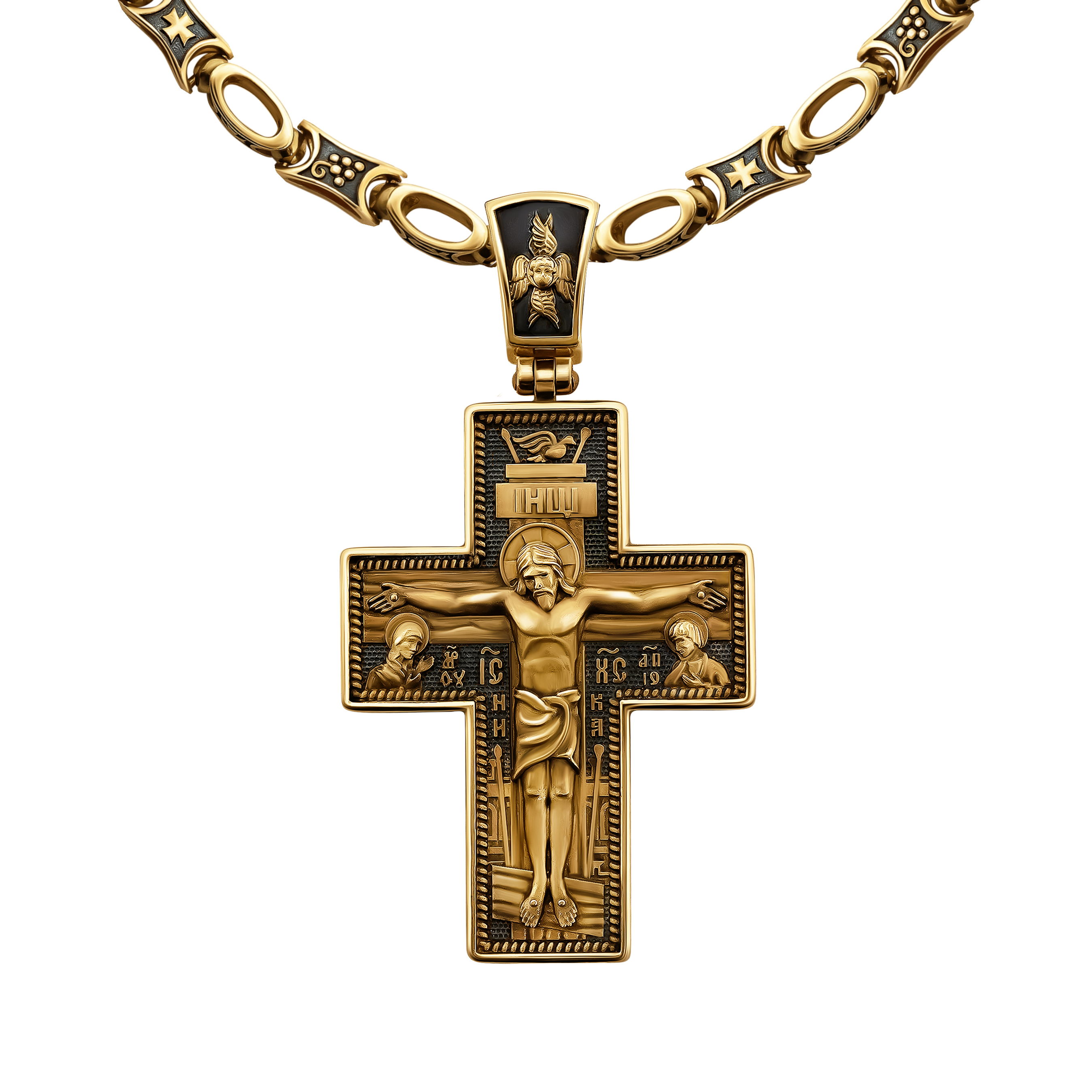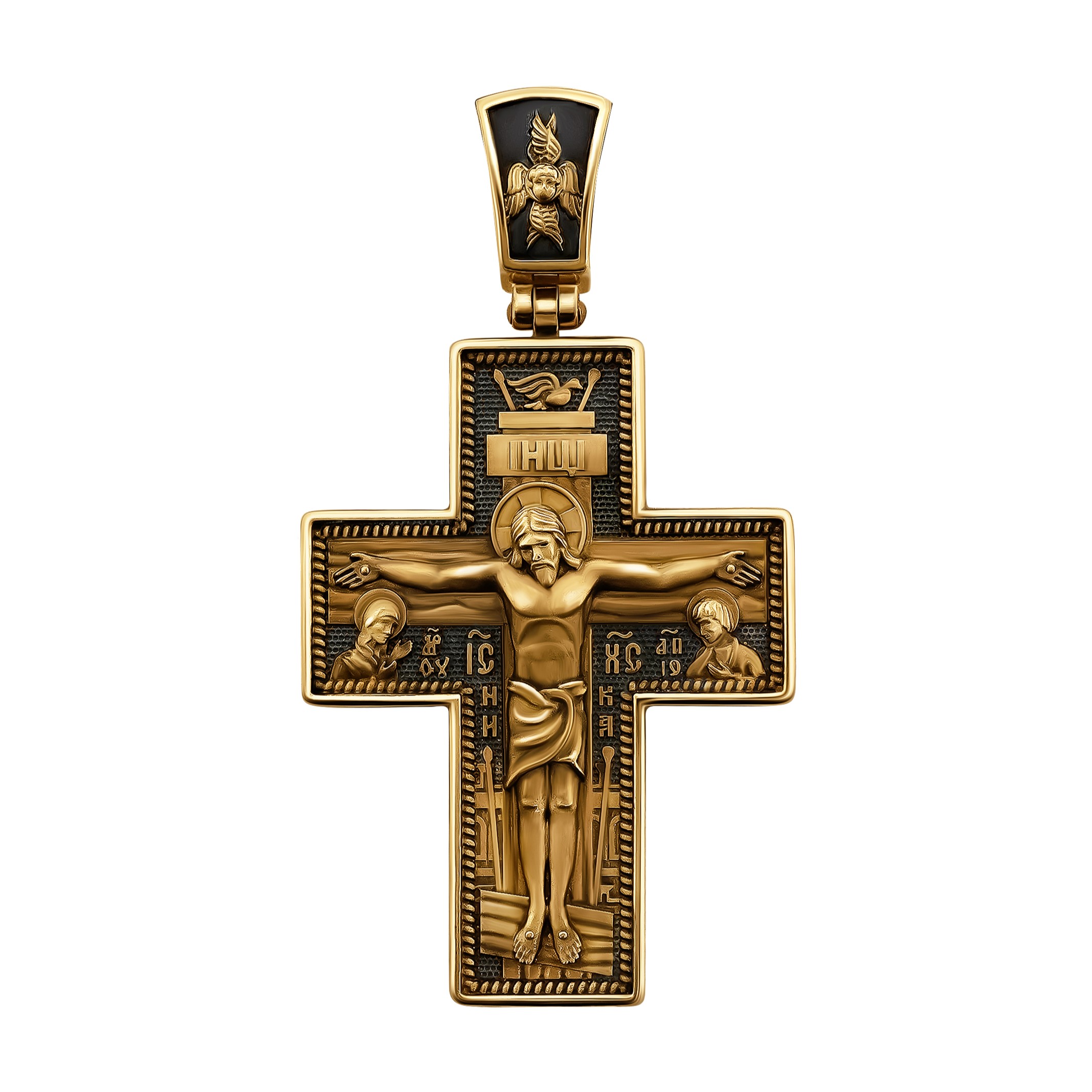 На лицевой стороне изображено Распятие Господа Иисуса Христа. С двух сторон Христу предстоят Пресвятая Богородица и св.пророк и Предтеча Господень Иоанн Крестиль, которые имеют особое дерзновение перед Богом молиться за всех людей.