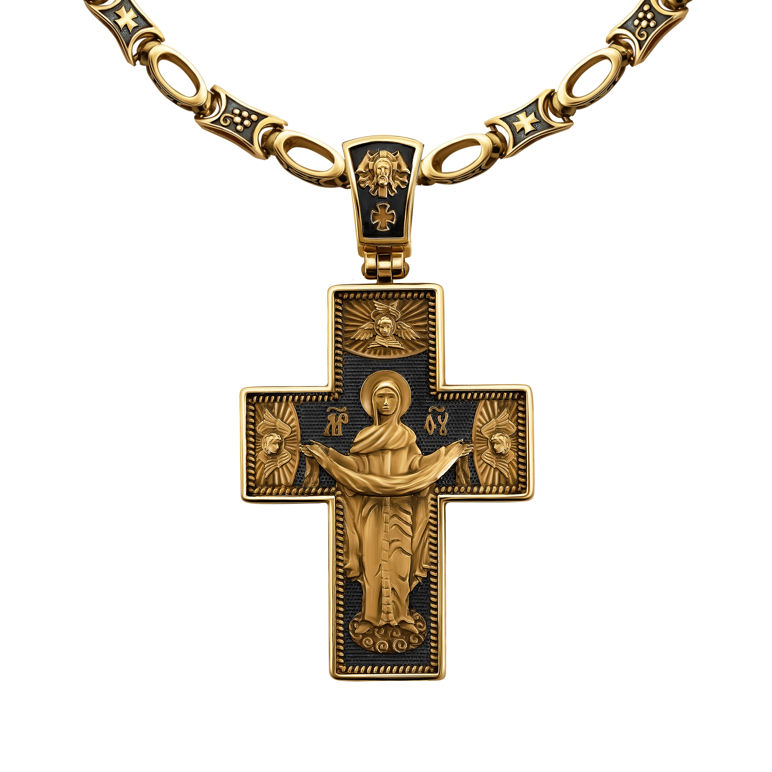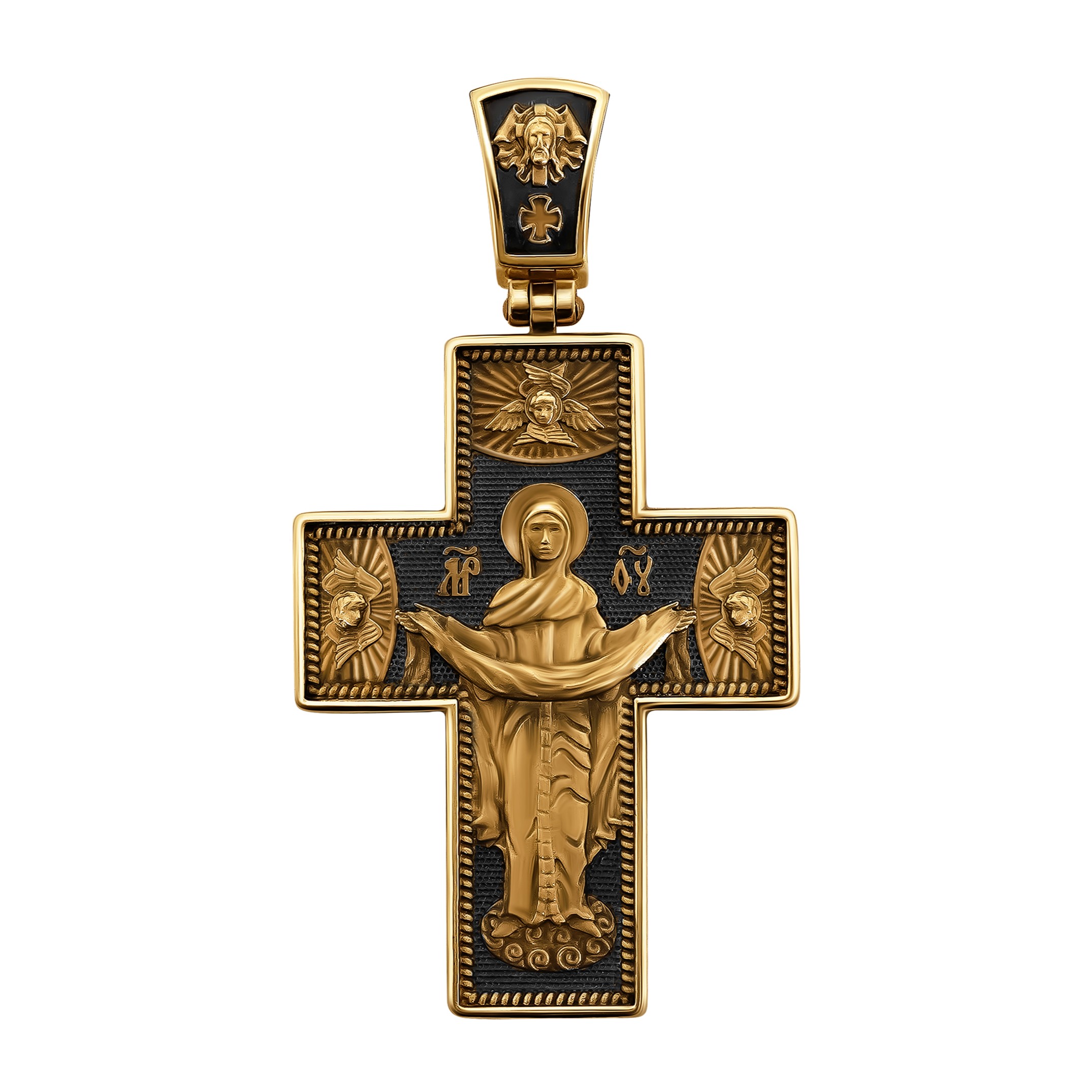 На обороте креста, в окружении крылатых Серафимов, изображена икона "Покров Пресвятой Богородицы".