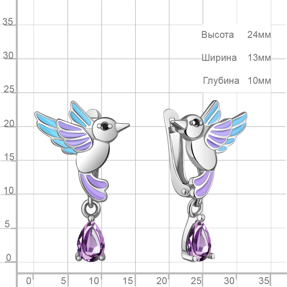 Серьги из серебра с аметистами, эмалью и ювелирными кристаллами