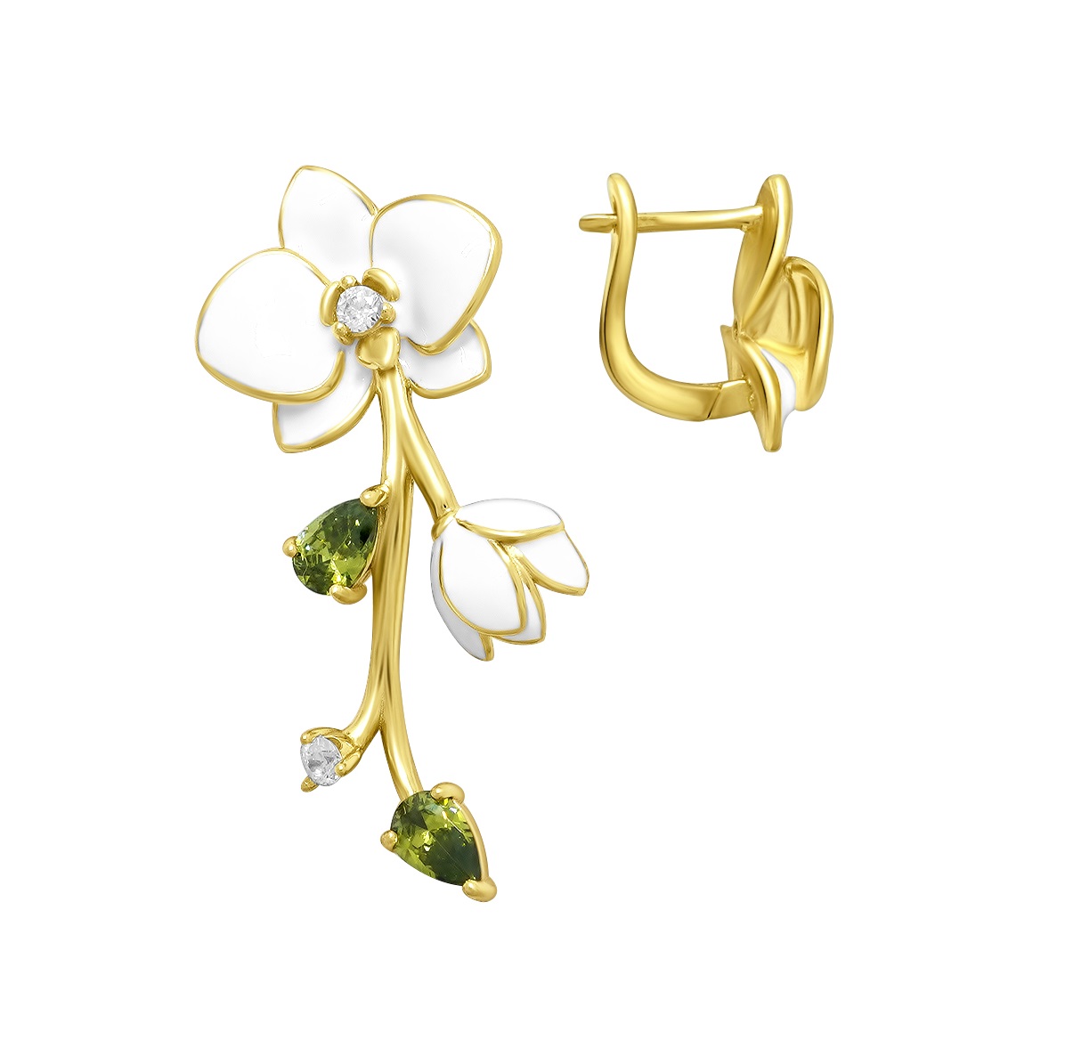 Серьги из серебра с позолотой, хризолитом, эмалью и фианитами