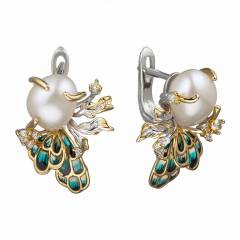 Серьги из серебра с позолотой, жемчугом, эмалью и фианитами