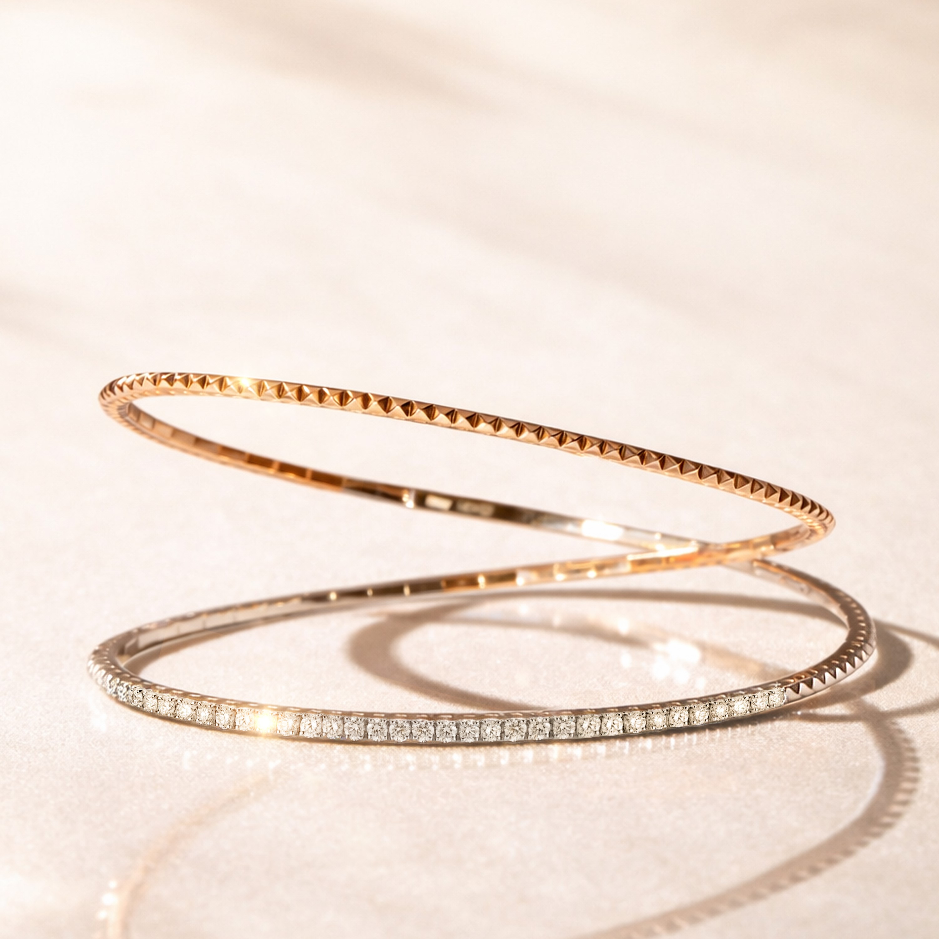 В основе браслета — сплав с памятью формы. Он делает конструкцию гибкой: браслет легко надевается, подстраивается под руку и всегда возвращается к изящной линии.