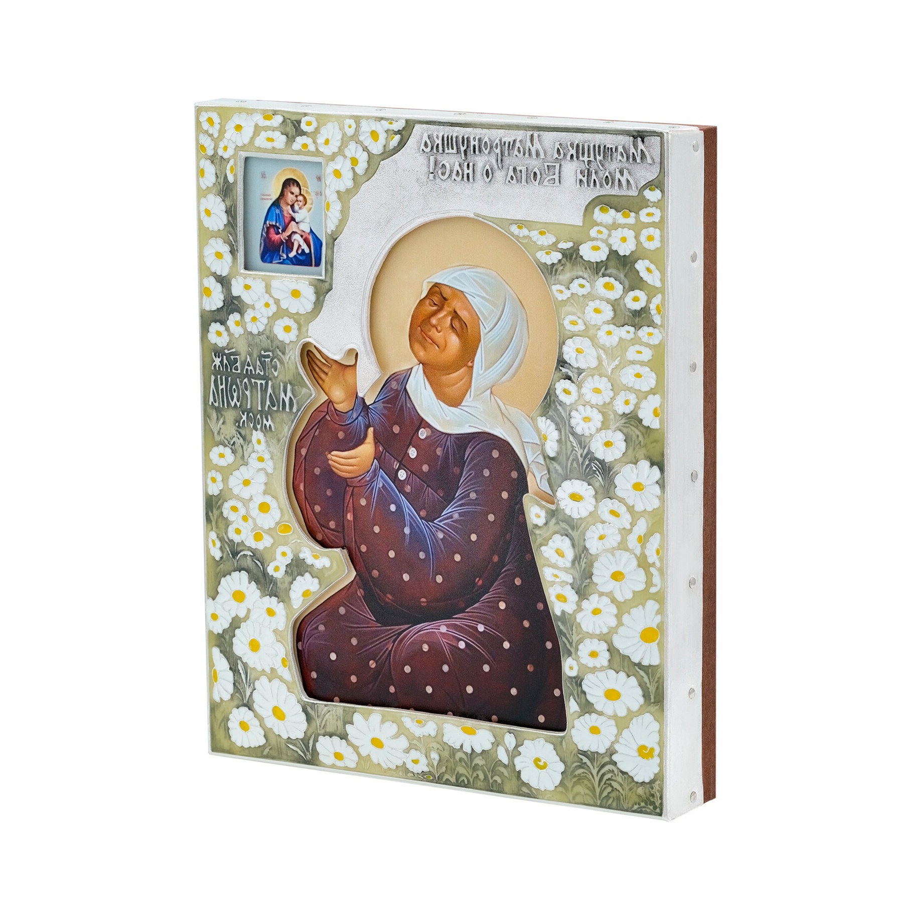 На этой иконе святая Матрона изображена молящейся Богородице перед Ее моленным образом «Взыскание погибших».