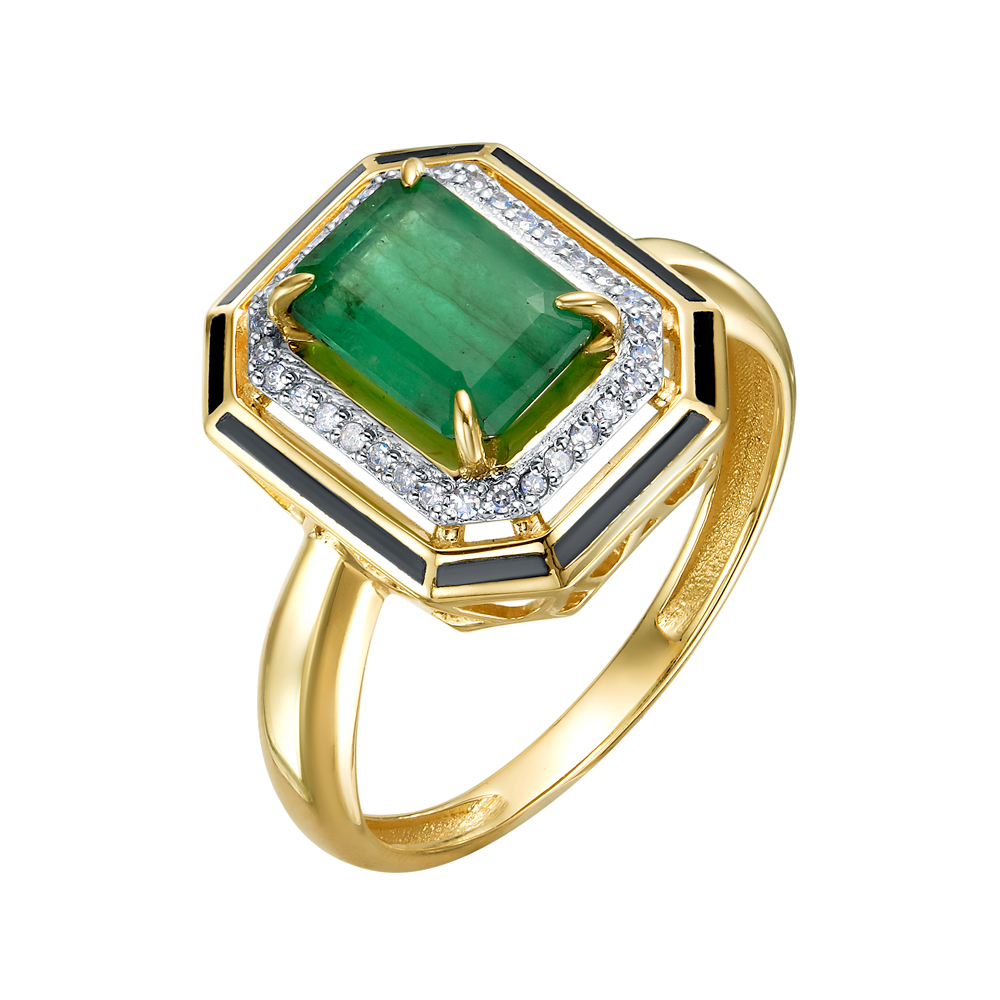 Кольцо из лимонного золота с бриллиантами, изумрудами и эмалью