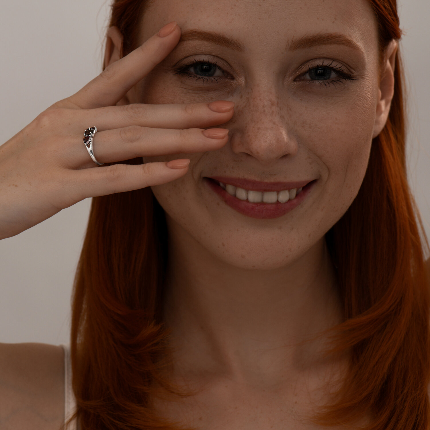 Кольцо из серебра с гранатами и раухтопазом