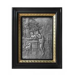 Панно обрамлено в лаконичную лакированную рамку из дерева, паспарту с золоченым орнаментом.