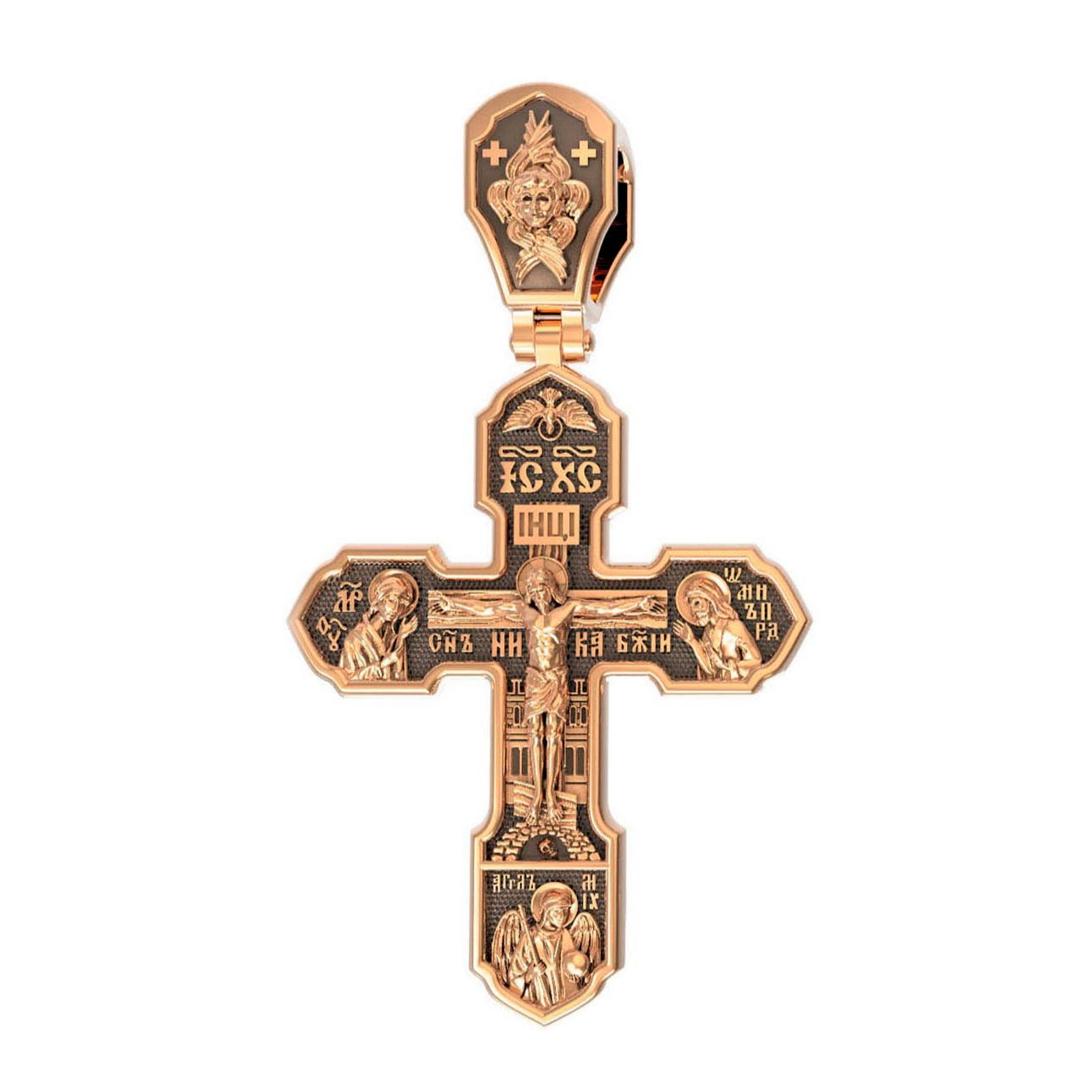 На лицевой стороне изображено Распятие Господа Иисуса Христа. Под основной перекладиной надписи-"НИКА", что в переврде с греческого означает "победитель",и словосочетание "СЫН БОЖИЙ".