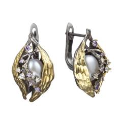 Серьги из серебра с позолотой, жемчугом и фианитами