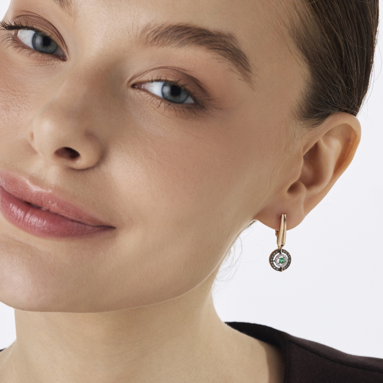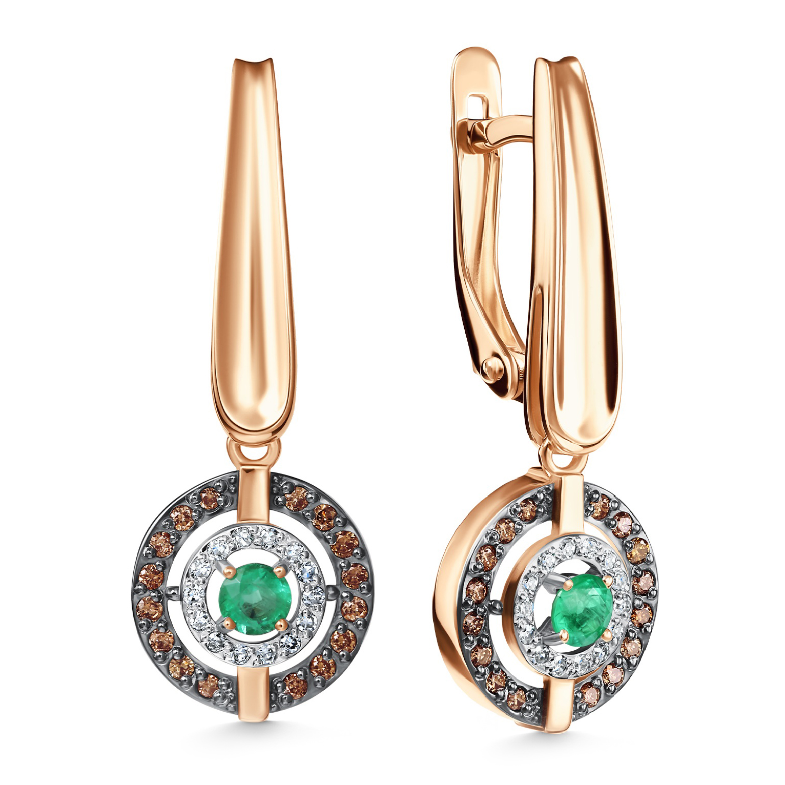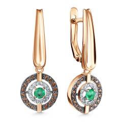 Серьги из золота с бриллиантами, коньячными бриллиантами и изумрудами